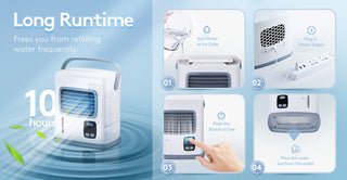 Long Lasting-Provides a 40% larger water tank than others, ensuring this cool air fan runs for 10 hours. You no longer have to run back and forth to refill water.